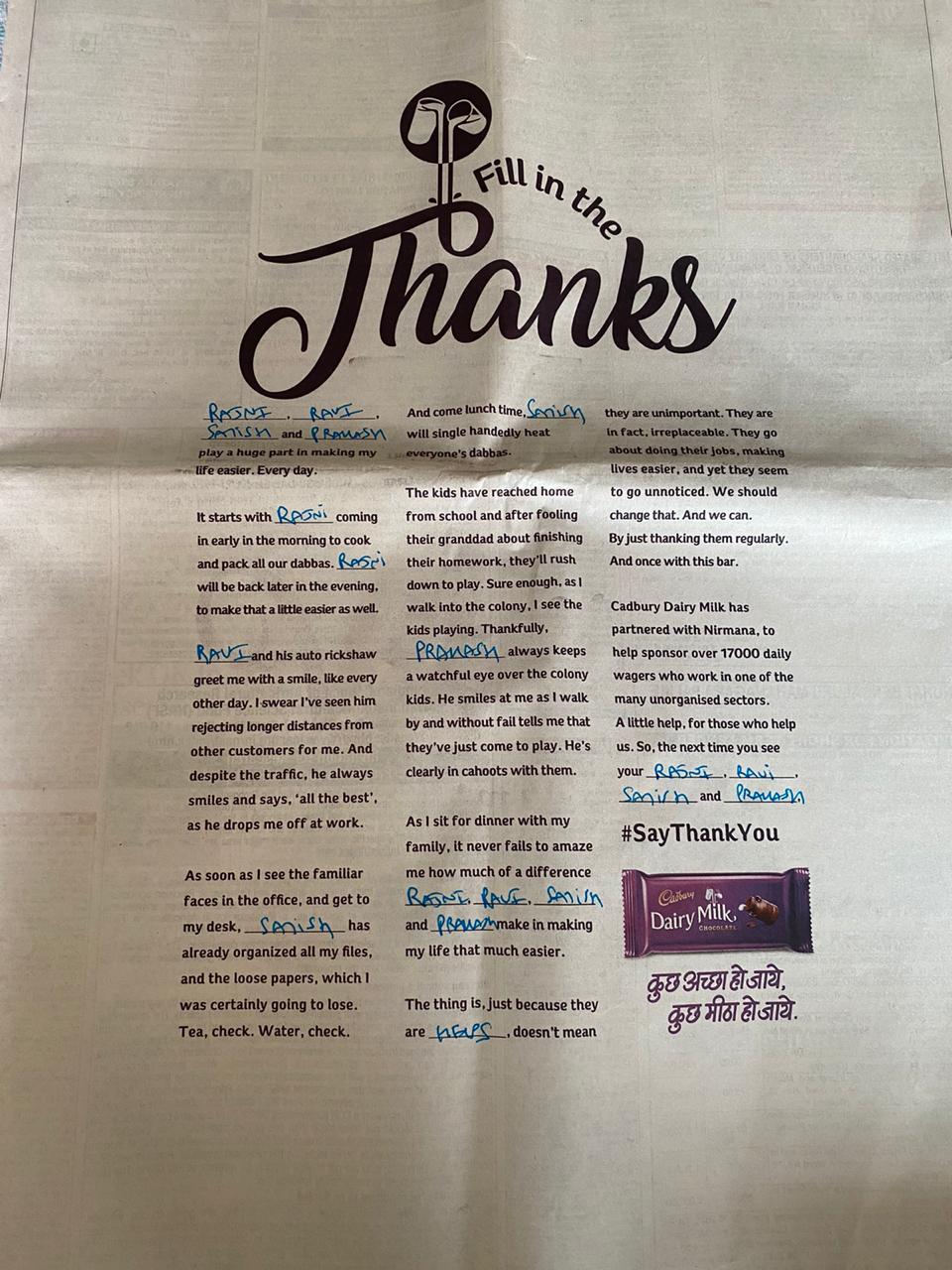 In today's world, when digital is increasingly becoming the media of preference for brands, Cadbury and Ogilvy India gave a refreshing twist to a classic way to reach out to 3.2 million people with a full page print ad that gave each reader a chance to fill in their personalized Thank You, for each person who makes their lives easier each day. The print ad plays on the insight that everyone has their own unique heroes who make their lives smooth and easy but usually go unnoticed. The copy takes the reader through a typical day in their lives and the people in it. The maids and cooks who pack their dabba, the rickshaw wala who’s a friend now and doesn’t say no to them, the office admin staff who organizes their desk and heats everyone’s dabbas, the society watchman who keeps a close eye on the kids playing around, leaving the blanks for the readers to add the names of the ones who play these roles in their lives, making each ad personal for each reader. The ad was released in 5 languages in 7 publications.