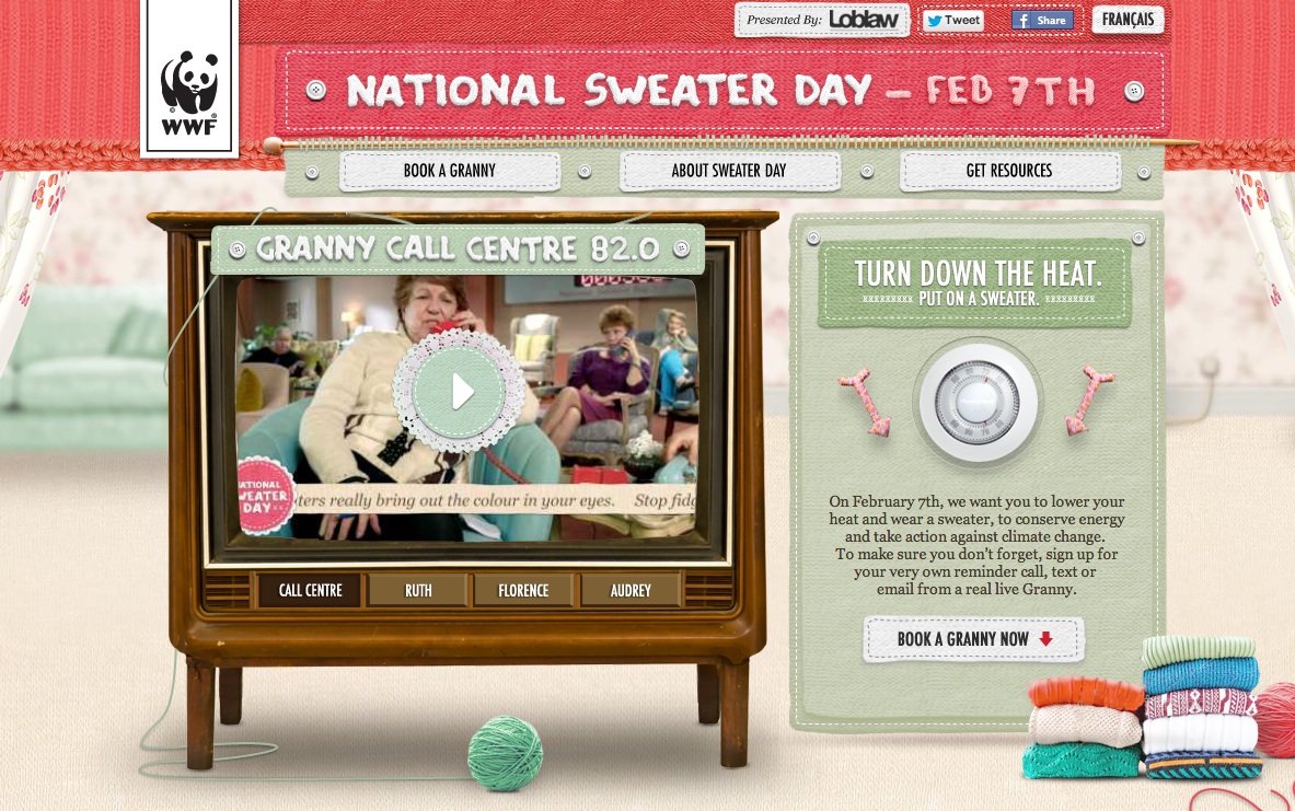 National Sweater Day and john st urges Canadians to turn down their thermostat and wear a sweater for one day in an effort to conserve energy and reduce greenhouse gas emissions. According to WWF, if every Canadian lowered their thermostat by just two degrees Celsius this winter, it would reduce greenhouse gas emissions by four megatons. The "Granny Call Centre" program invites Canadians to visit SweaterDay.ca and register to receive a call, text or email from a granny on Feb. 7 reminding them to don a sweater and turn down the heat. This year's event also enables participants to choose from one of four types of grannies, ranging from "Sweet" and "Doting" to "Cranky"and "Guilt-tripping," to deliver the message.
